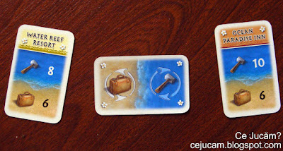 | O licitaţie în 3 jucători. Jucătorul verde a câştigat construcţia (cu 14), iar ceilalţi 2 sunt la egalitate pentru turişti (cu 6). |