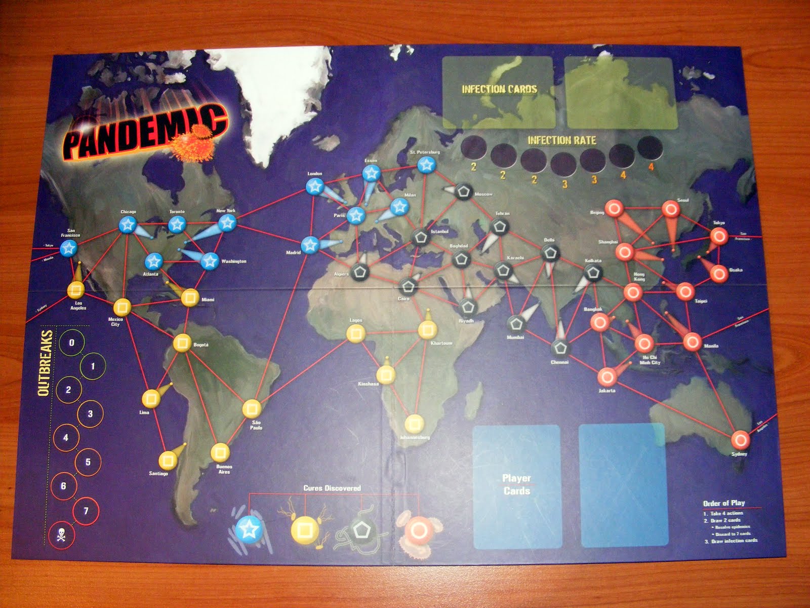 Pe tabla de joc este reprezentată harta lumii, pe care sunt așezate câteva cele mai mari orașe care vor fi centre pentru epidemiile cu care se bat jucătorii. Orașele sunt alese probabil ca răspândirea lor să fie cât mai uniformă, un fapt amuzant fiind includerea micului Essen, oraș în care se desfășoară unul dintre cele mai mari târguri de jocuri de societate din lume. Calitatea materialului din care este făcută harta este bună, însă puțin cam moale, zgâriindu-se destul de ușor.