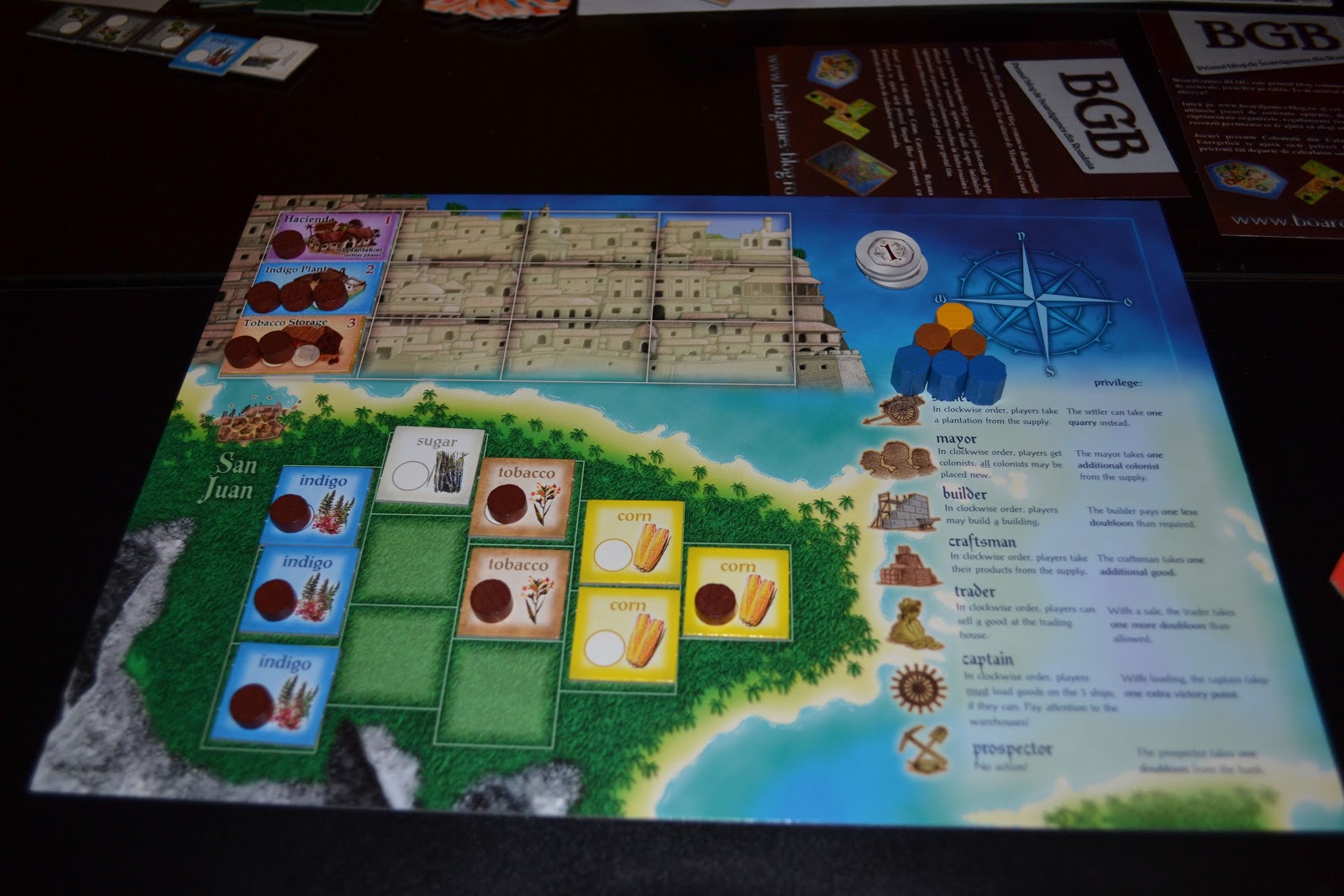 Pentru cei care nu știu, Puerto Rico este un fel de tataie al jocurilor economice, nu neapărat datorită vârstei cât a aprecierii marii majorități a jucătorilor de jocuri de societate, mulți ani fiind jocul care a ocupat locul 1 în topul BoardgameGeek. În acest moment ocupă cea de-a doua poziție, fiind detronat la începutul anului de Twilight Struggle. Este un joc care folosește un mecanism de roluri, adică fiecare jucător, la tura sa trebuie să aleagă unul din cele 7 roluri disponibile, pe care le vor îndeplini toți jucătorii, cel care l-a ales însă primind și un bonus. Este foarte interesant și important să alegi rolul potrivit pentru a te ajuta cât mai mult pe tine fără a-i ajuta prea mult pe ceilalți.