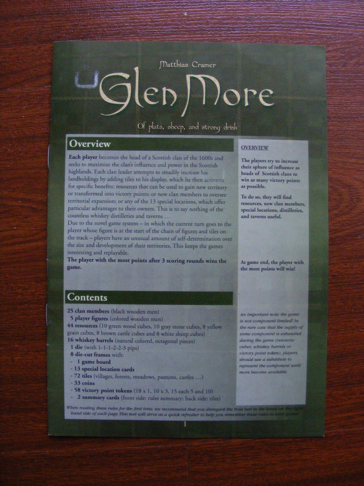 - Nici la capitolul componente, Glen More nu impresionează. Se integrează perfect în seriile alea, adică desene simpluţe, cartoane aşa şi-asa, culori şterse, totul ţinut la un nivel simplu şi perfect funcţional. Nu s-au chinuit nici măcar să gândească un meeple cu kilt, l-au împrumutat pe cel din Carcassonne.