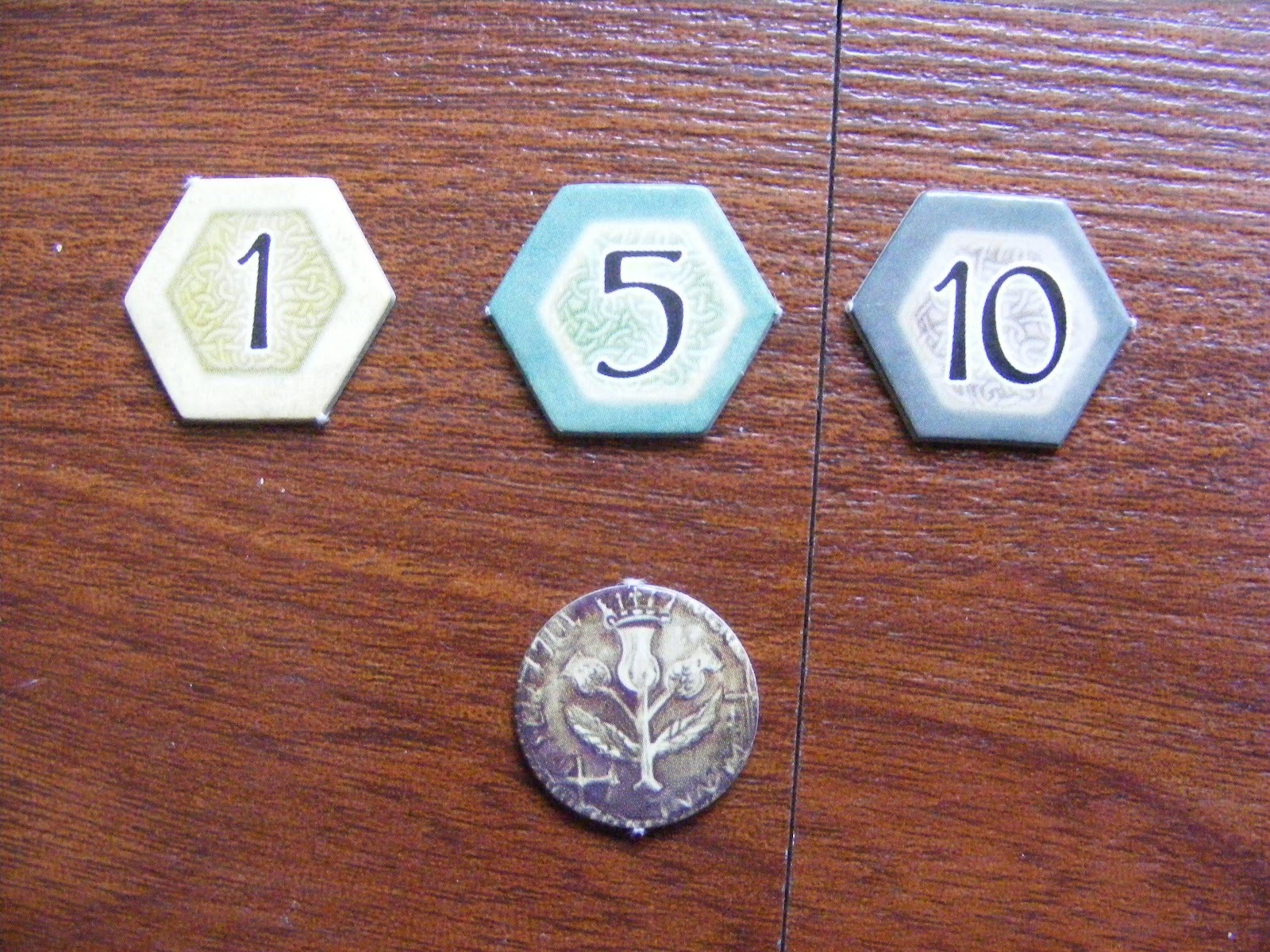 - 72 de plăcuțe, unele unice, pentru resurse. Sunt colorate în funcție de tipul lor: gri - castele și sate, galben și verde - resurse, albastru - lacuri etc.