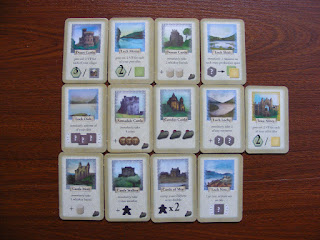 Aşa cum vă spuneam, jocul împrumută de la Carcassonne aşezarea de plăcuţe. Aşa că veţi găsi în cutia Glen More 72 de plăcuţe cu diverse construcţii necesare clanului vostru cât şi câteva locaţii speciale din Scoţia, cum ar fi câteva castele sau loch-uri. Pe spatele fiecărei plăcuţe există un număr de la 0 la 3 care controlează momentul când plăcuţa intră în joc.