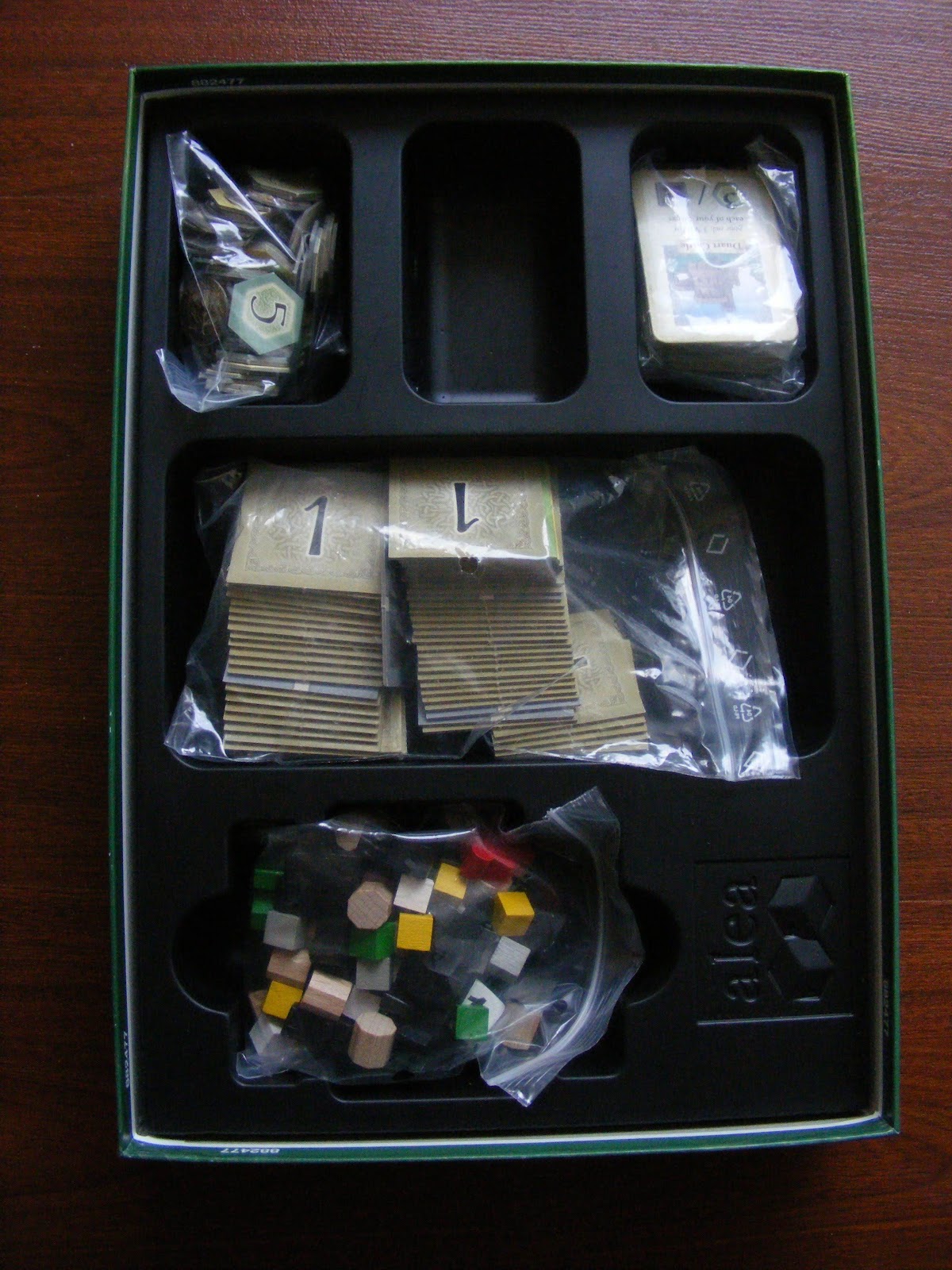 - Insertul cutiei este tot în linia alea, dacă ați deschis vreodată cutia de Puerto Rico, de exemplu, o să vi se pare foarte familiar. Din păcate, aceeași problemă ca la celalte: mai multe compartimente decât punguțe ori să lași componentele fără pungi înseamnă să le amesteci total.