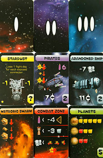 2. zborul prin glaxie adică întoarcerea celor 8/12/16 cărţi de evenimente (nr. diferă în funcţie de etapă şi sunt alese la întâmplare din cele multe care vin cu jocul) una câte una şi confruntarea navelor cu ele